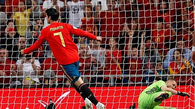 La brillante jugada no pudo tener mejor finalización del delantero con su disparo ajustado a un poste, imparable. como una España lanzada hacia la Eurocopa 2020.