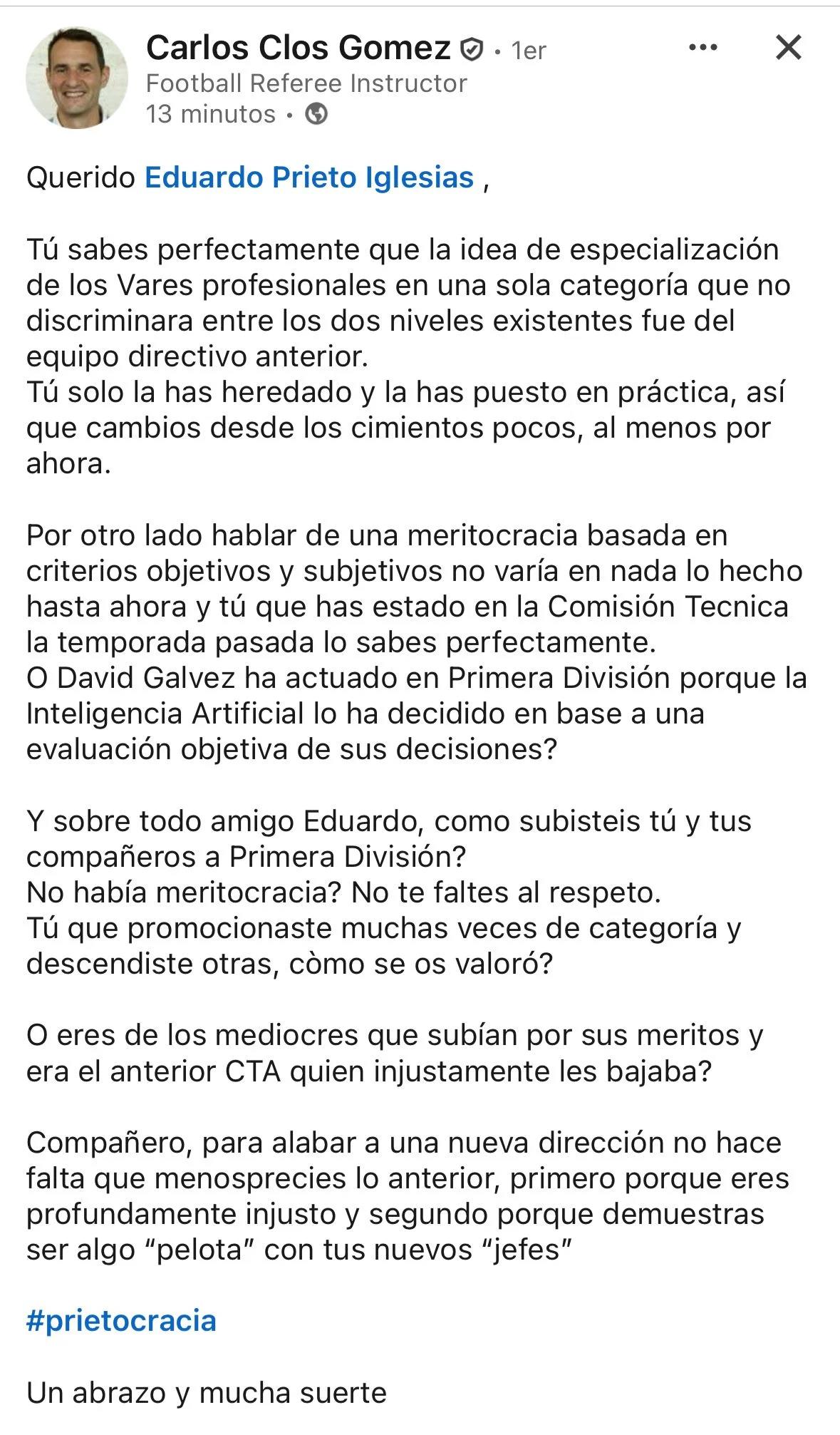 La respuesta llegó al día siguiente. Anoche, Clos Gómez, anterior responsable del VAR, señaló públicamente a Prieto Iglesias. También a través de Linkedin. El aragonés escribió un post en el que se tomó a broma los logros de Prieto Iglesias con tan solo dos meses en el cargo. «Sabes perfectamente que la idea de especialización de los Vares profesionales en una sola categoría, que no discriminara entre los dos niveles existentes, fue del equipo directivo anterior. Tú solo la has heredado y la has puesto en práctica, así que cambios desde los cimientos pocos, al menos por ahora», aseguró.