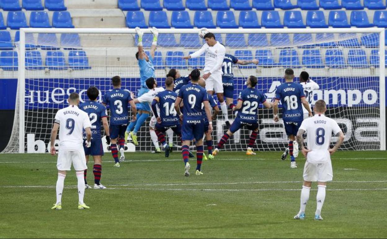 Un doblete del central francés permite a los blancos remontarle al Huesca un partido que se le había puesto cuesta arriba al equipo de Zidane con el golazo de Javi Galán tras el descanso