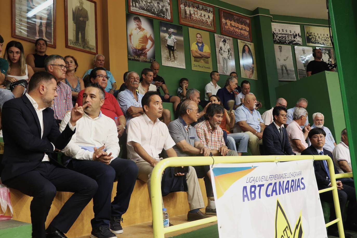 Además de los trofeos, los cónsules de Corea y Japón, también en el palco, recibían el escudo de Gáldar por parte del consistorio norteño; una placa de la federación canaria y el libro de Juan Coruña «viendo también se aprende» que lo dio en mano a cada uno de ambos diplomáticos el propio exluchador.