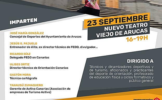 Orientación Canarias y el Ayuntamiento de Arucas celebrarán el próximo viernes 23 de septiembre una jornada formativa para presentar los Circuitos Permanentes de Orientación (CPO) como recurso turístico, deportivo, educativo y de ocio, en un acto que se celebrará en el Nuevo Teatro Viejo entre las 16.00 y 19.00 horas y en el que además se dará a conocer el primer CPO homologado por la Federación Española de Orientación (FEDO), con base en el municipio norteño. La inscripción es gratuita hasta completar aforo y se puede realizar en orientacioncanarias.com.