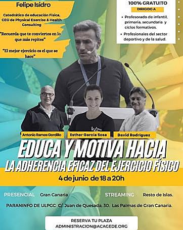 Felipe Isidro, catedrático de Educación Física, compartirá ponencia con otras autoridades del gremio en la jornada formativa que tendrá lugar el próximo martesEn una iniciativa didáctica emprendida, conjuntamente, por la consejería de Educación, Formación Profesional, Actividad Física y Deportes del Gobierno de Canarias, la Asociación Canaria de Profesionales de la Gestión del Deporte (Acagede) y la Universidad de Las Palmas de Gran Canaria, el próximo martes tendrá lugar una jornada formativa bajo la denominación «Educa y motiva hacia la adherencia eficaz del ejercicio físico», dirigida al profesorado en general y a profesionales del sector del deporte y la salud. Será gratuita y se celebrará en el Paraninfo de 18.00 a 20.00 horas, con posibilidad de que, los que no puedan asistir de manera presencial, puedan, también, acceder a la misma por streaming. A través del mail administracion@acagede.org ya se está realizando la reserva de plazas. El reputado Antonio Ramos Gordillo, el que fuera jugador del legendario Guaguas de finales de los ochenta David Rodríguez y Esther García compartirán ponencia con Felipe Isidro, catedrático de Educación Física y CEO de la consultoría Physical Exercise & Health. Isidro (Barcelona, 1966) avanza que la ocasión «va a dejar una enseñanza fundamental».
