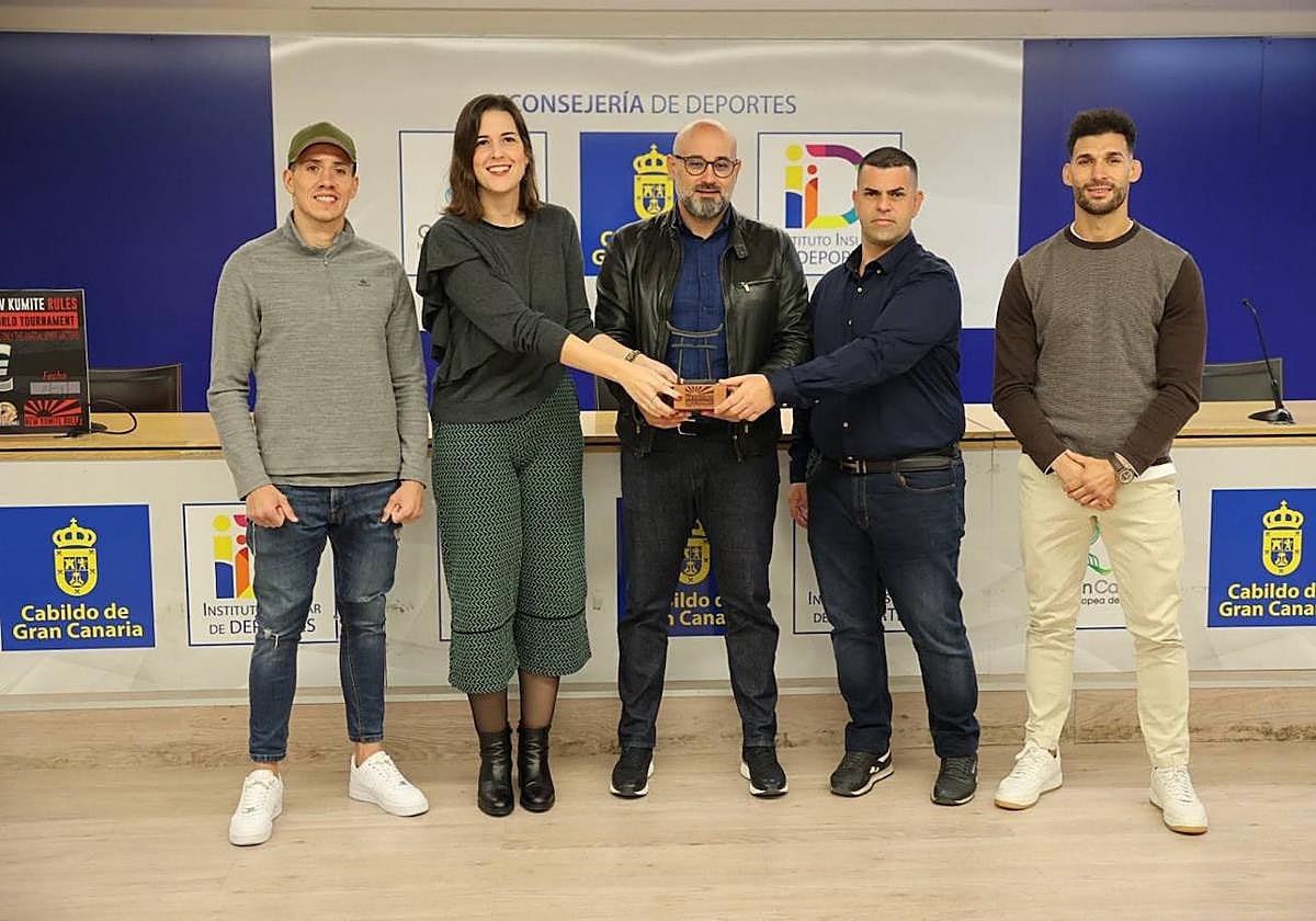 Aridany Romero, consejero de Deportes del Cabildo de Gran Canaria, y Carla Campoamor, concejala capitalina de Deportes, arroparon a Néstor Navarro, promotor del New Kumite Rules, quien, a su vez, estuvo acompañado por los deportistas Alcorac Caballero y Máximo Suárez.