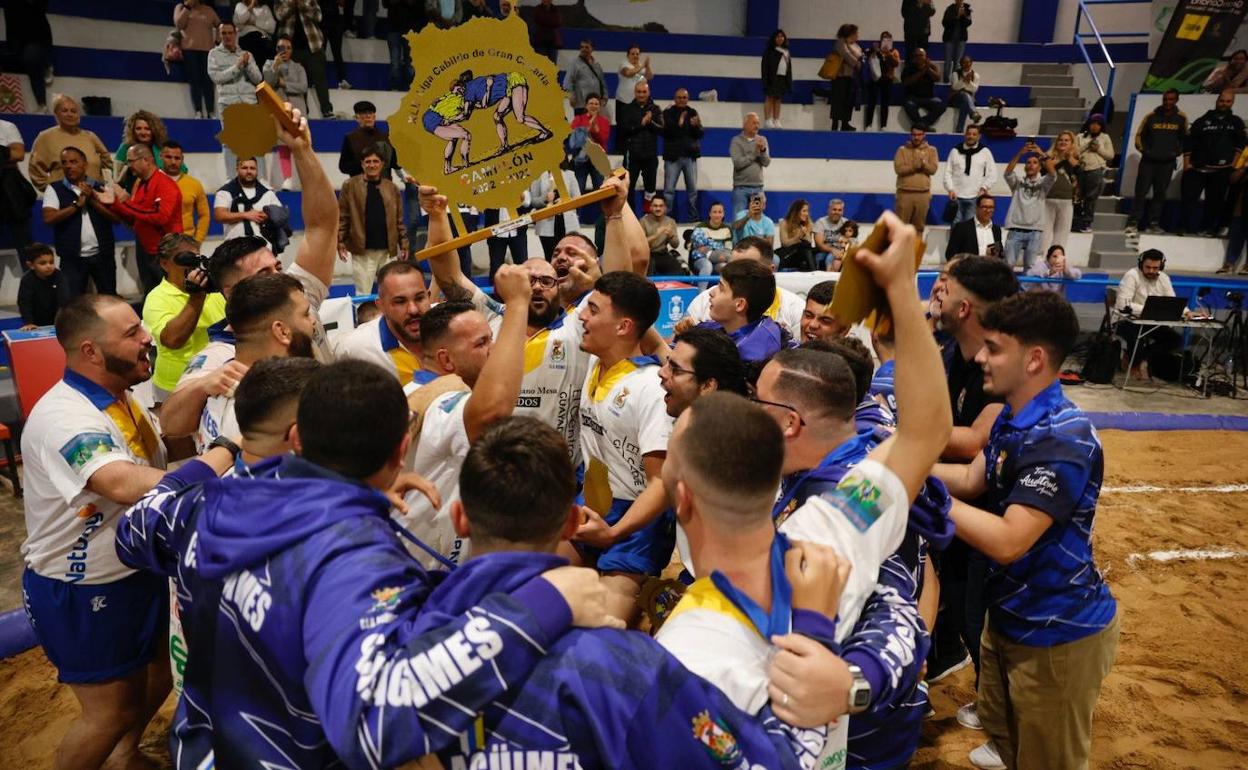 Ya hay campeón de la Superliga de Segunda Categoría, Trofeo Cabildo de Gran Canaria, y lo es con todos los honores. El Unión Agüimes se alzó este viernes con el título tras imponerse por un ajustadísimo 12-11 al Santa Rita en una luchada que superó las dos horas de duración y que reunió todos los ingredientes posibles para catalogarse como estelar. Un llenazo a reventar en el terrero de Vecindario, dos equipos de extraordinaria calidad y entrega, deportividad a raudales y, faltaría más, igualdad e incertidumbre hasta el desenlace, manteniendo las emociones del respetable en todo momento para coronar una noche épica y en la que, además de coronar al Agüimes, salió vencedor el deporte vernáculo por el espectáculo brindado.