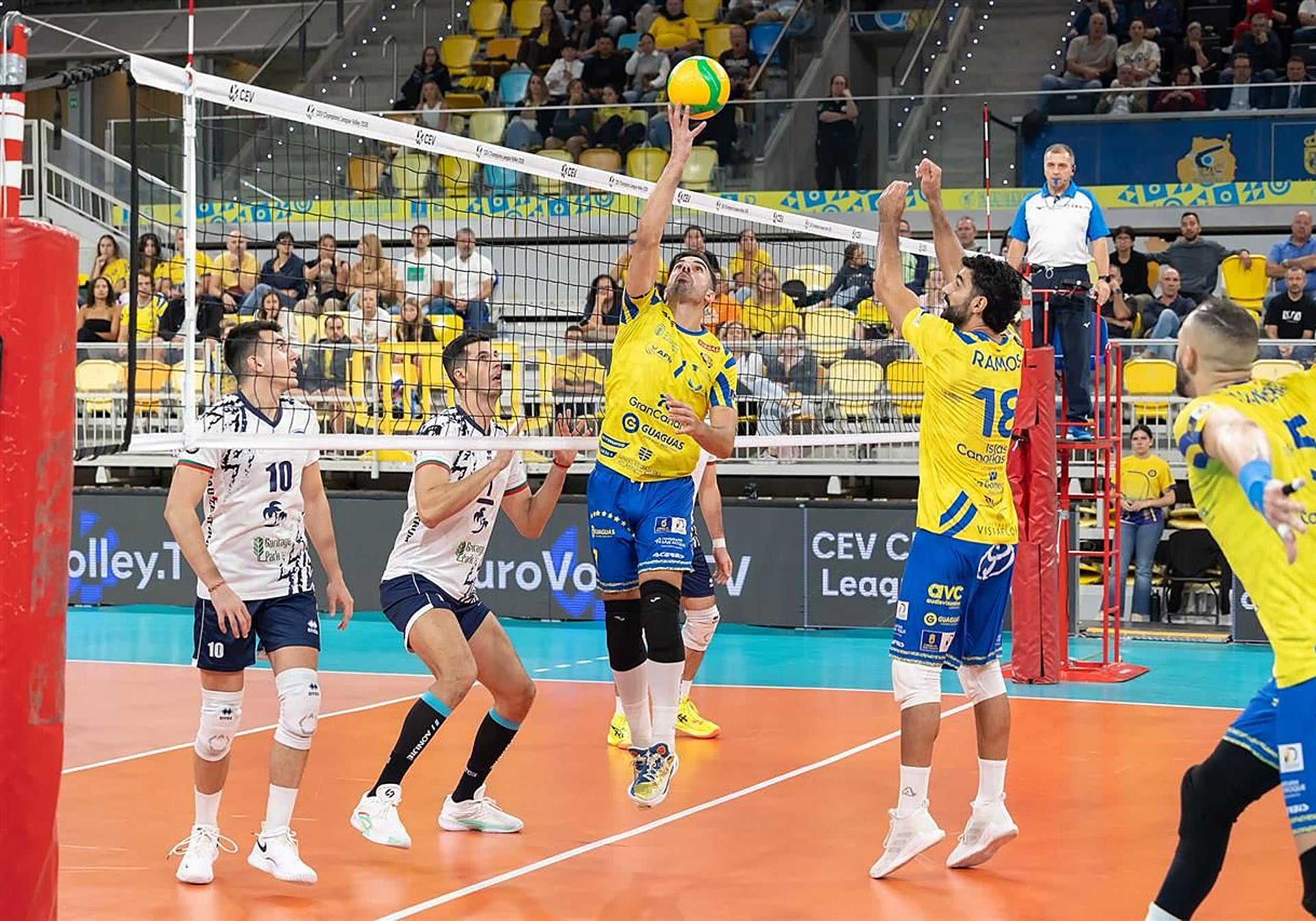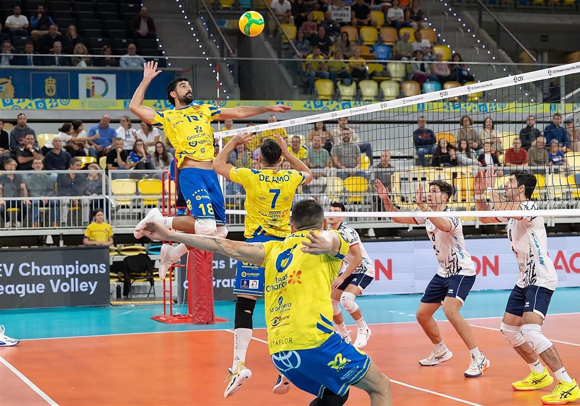 Incidencias: encuentro correspondiente a la ida de la tercera ronda de acceso a la Liga de Campeones CEV 2025-2026 disputado en el Gran Canaria Arena ante 900 espectadores.