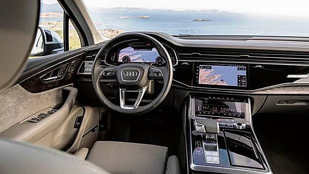 La arquitectura del puesto de conducción del renovado Q7 armoniza perfectamente con el nuevo concepto operativo, que incluye dos grandes pantallas táctiles con respuesta háptica y acústica al hacer clic en los controles.