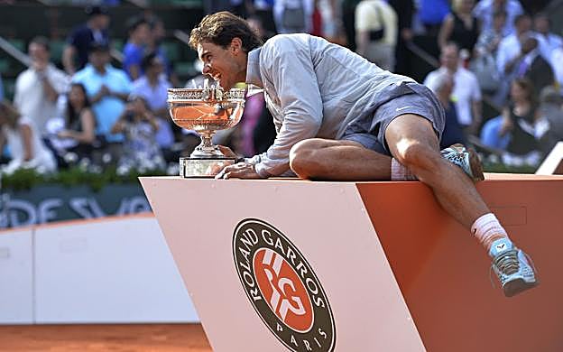 2014. Ganar cinco veces consecutivas el título en Roland Garros parecía una quimera. Hasta que llegó Nadal y demostró que no había listón demasiado elevado para su tenis en París. Novak Djokovic claudicó antes su empuje por 3-6, 7-5, 6-2 y 6-4, tras tres horas y media de partido. Era el trofeo número 64 en la carrera del español y el decimocuarto de Grand Slam.