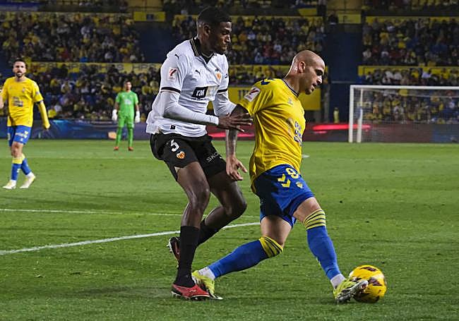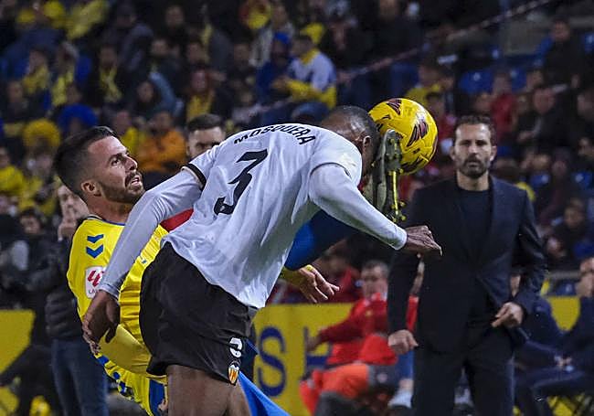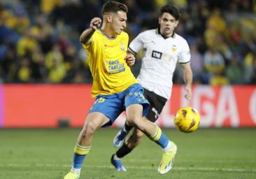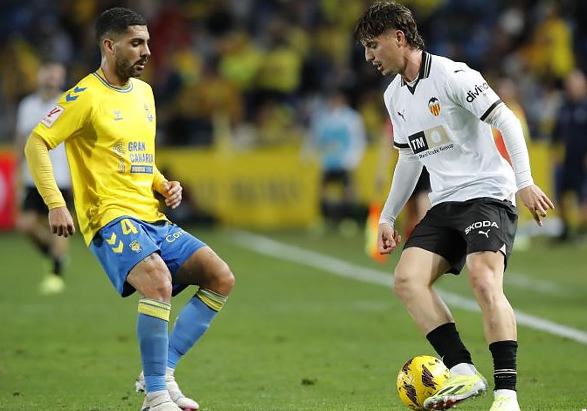 Se sabía que sería un partido de lija por las características de un Valencia muy cartesiano, conocedor de sus límites y excelente rentabilizador de las mínimas opciones. Así ha prosperado y así quiso que fuera la faena en el Gran Canaria. Un plan de contención que dejó a la UD en su versión más horizontal, apenas dos intentonas al descanso sin que Mamardashvili tuviese que justificar sus habichuelas. Tampoco es que a Valles le pusieran a prueba, aunque un remate de Mosquera, con excesivo giro de cuello, ya al borde del intermedio. Entre medias, paridad al máximo, con los espacios muy caros y una densidad general que se tradujo en que no pasara nada de nada. Habría que empujar hasta el final y armarse de mayor paciencia y precisión.