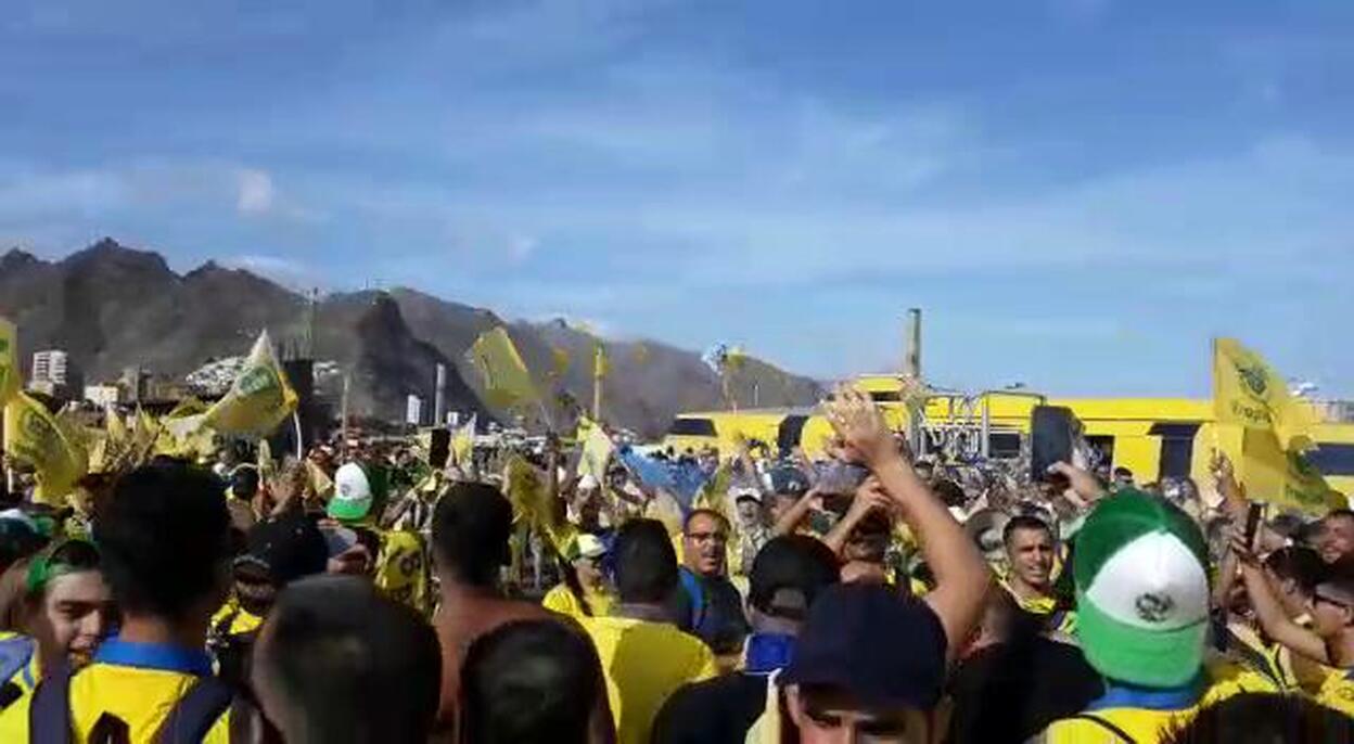 Recibimiento festivo a los aficionados de la UD Las Palmas que llegaron en barco a la capital tinerfeña en las horas previas al derbi de este sábado. Mientras la afición llegó por mar, el equipo que esta tarde se enfrentará al Tenerife aterrizaba en Los Rodeos, donde fue recogido por la guagua oficial del club.