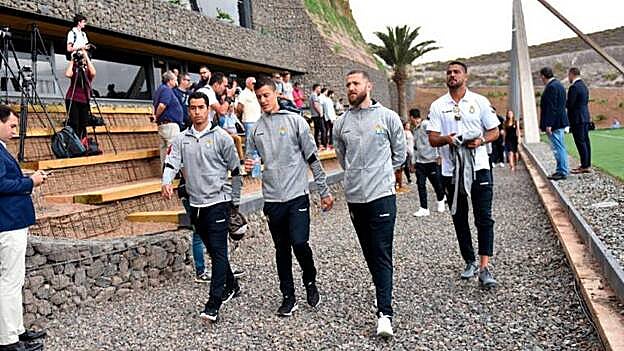 La plantilla de la UD Las Palmas al completo acudió ayer, lunes, al acto institucional de inauguración de las nuevas instalaciones deportivas del conjunto amarillo. En la imagen, de izquierda a derecha, Sergio Araujo, Martín Mantovani, David Timor y Aythami Artiles, a su llegada al recinto.