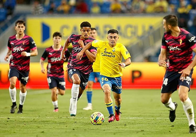 En los primeros compases del choque, el equipo de García Pimienta se encontró cómodo sobre el verde del Gran Canaria, siendo el claro dueño y señor del balón. El descaro de Alberto Moleiro se dejó ver en los ataques amarillos, sin duda, una señal del buen hacer del equipo desde atrás. En el minuto 4 el extremo Fran Pejiño lo intentó desde muy lejos poniendo en serios apuros a la defensa asturiana. Primera ocasión para la UD. La esencia de los insulares se volvía a ver con largas posesiones de balón, elaborando jugada hasta encontrar la oportunidad de crear peligro. Sin embargo, el cuadro gijonés se defendía bien y en los primeros 15 minutos apenas sufrían atrás.