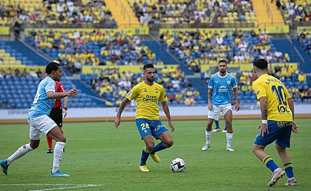 No regaló Las Palmas ni un minuto de tregua a su rival. Desde el inicio saltó a por el cuello de Fuzato, arquero del Ibiza. Con un ritmo frenético, lo evidente era que los celestes también iban a encontrar espacios para el galope. Cuando el césped parecía un mundo a las carreras al contragolpe de Herrera, viejo conocido, Eric Curbelo sacaba las tijeras.