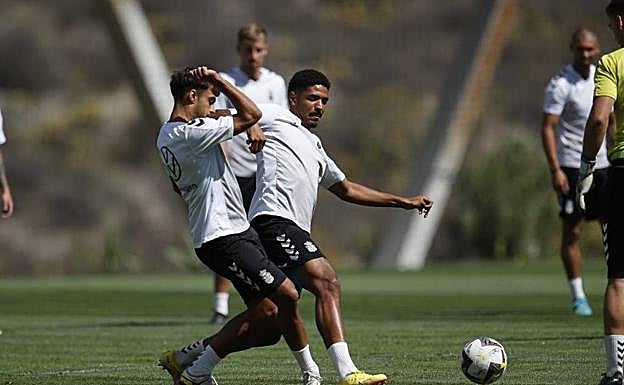 😊 Nicolás Ortega y Eder Sarabia se saludan antes del comienzo del partido. Buenos recuerdos en la isla del ahora técnico del Andorra.