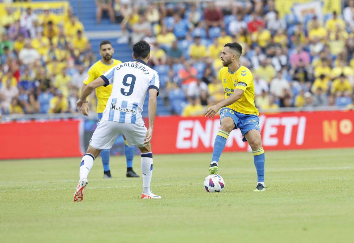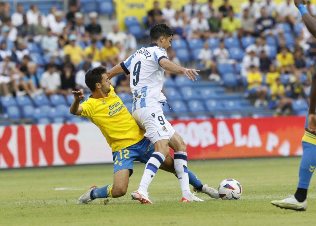 Con Sory Kaba directo al once titular, Las Palmas salió a morder desde el pitido inicial. Sin paliativos. Consciente de que la Real podía hacer sangre si no conquistaba la pelota y mordía en la presión. En una de esas, cuando apenas nadie había roto a sudar, en una salida desde atrás de Remiro, casi cae el gol de Sandro. Anticipó Mika y Viera encontró al punta, que le pegó fuerte y alto. Faltó poco. Entraba solo Kaba para empujarla, pero Sandro hizo lo que se le pide a los delanteros, pegarle a puerta. Ni tres minutos habían corrido.