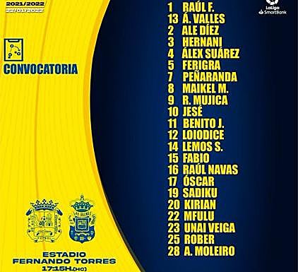 La lista de 22 jugadores convocados para la cita de mañana en el estadio Fernando Torres la componen los porteros Raúl Fernández y Alvaro Valles los defensas Ale Díez, Alex Suárez, Ferigra, Alvaro Lemos, Raúl Navas los centrocampistas Benito, Hernani, Maikel Mesa, Loiodice, Fabio, Oscar Clemente, Kirian, Mfulu, Unai Veiga, Rober y Moleiro y los delanteros Peñaranda, Mujica, Sadiku y Jesé.