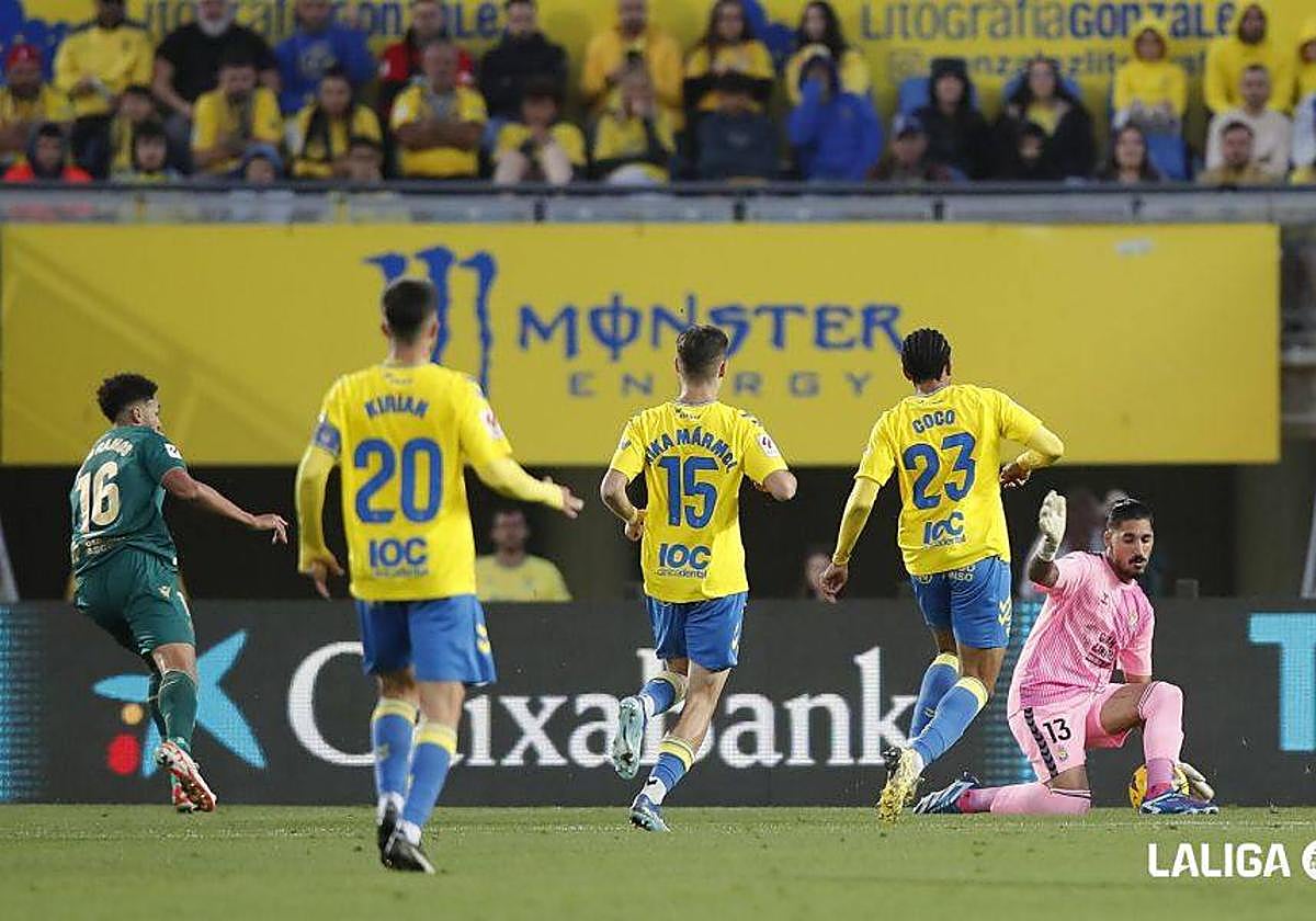 La superioridad de Las Palmas era grotesca. El Cádiz fiaba todo a algún desliz en la salida de balón de los isleños o, si acaso, a algún pelotazo. En una de esas, Chris Ramos ganó la espalda a Coco y se fue a por Valles. Pero se estrelló con un coloso. Podía haberlo hecho mejor el delantero, pues su disparo fue flojo, pero el arquero salvó un mano a mano y, esta temporada, ya van unos cuantos. A gritos pide la llamada de la selección española. Su nivel, intachable, bien lo merece. Al descanso, uno arriba.