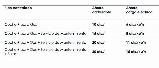 Esta alianza comercial combina las soluciones energéticas de los clientes en ambas compañías, ofreciéndoles un ahorro que será mayor en función de sus servicios contratados. Así, sumando su contrato de luz o gas y repostajes obtienen 10 céntimos por litro. Añadiendo el servicio de mantenimiento de Naturgy logran hasta 15 cts./l. Si se cuenta con el mantenimiento y con el suministro de luz y gas de manera conjunta, el ahorro alcanza los 20 cts./l. El mayor ahorro (30 cts./l) se obtiene si además se instalan las placas solares con Naturgy.