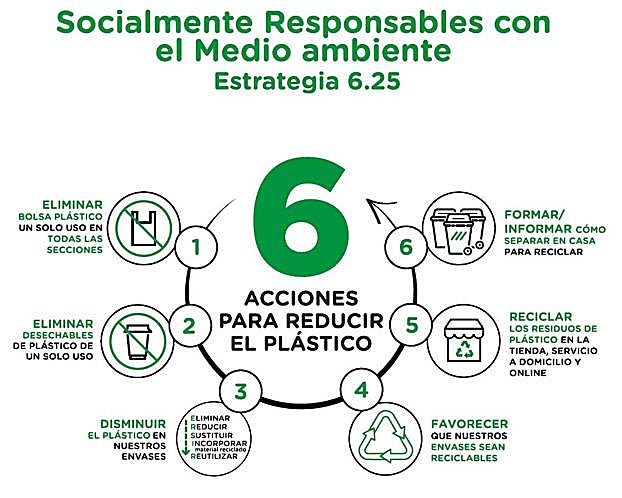 La Estrategia 6.25, que tiene el triple objetivo para 2025 de reducir un 25 % el plástico, hacer todos los envases reciclables y reciclar todos los residuos plásticos, se está llevando a cabo a través de 6 acciones que implican cambios en diferentes procesos de la compañía, desde la definición de los envases del futuro a la coordinación con los proveedores, la adaptación de las tiendas, la gestión de residuos, la logística, etc.