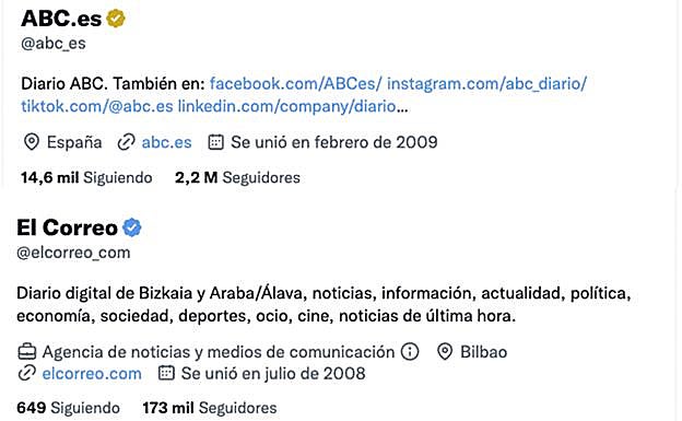 Lo mismo ocurre con otras cuentas oficiales de algunos medios. Por ejemplo, la de ABC se muestra con una marca dorada, mientras que la de El Correo tiene un 'check' azul. Según las nuevas reglas de Twitter, todas las cuentas de ministerios deberían tener el símbolo gris, mientras que las de medios de comunicación tendrán una verificación dorada, dejando las azules para los perfiles que hayan pagado la suscripción y hayan sido verificados por la plataforma tras un análisis completo.