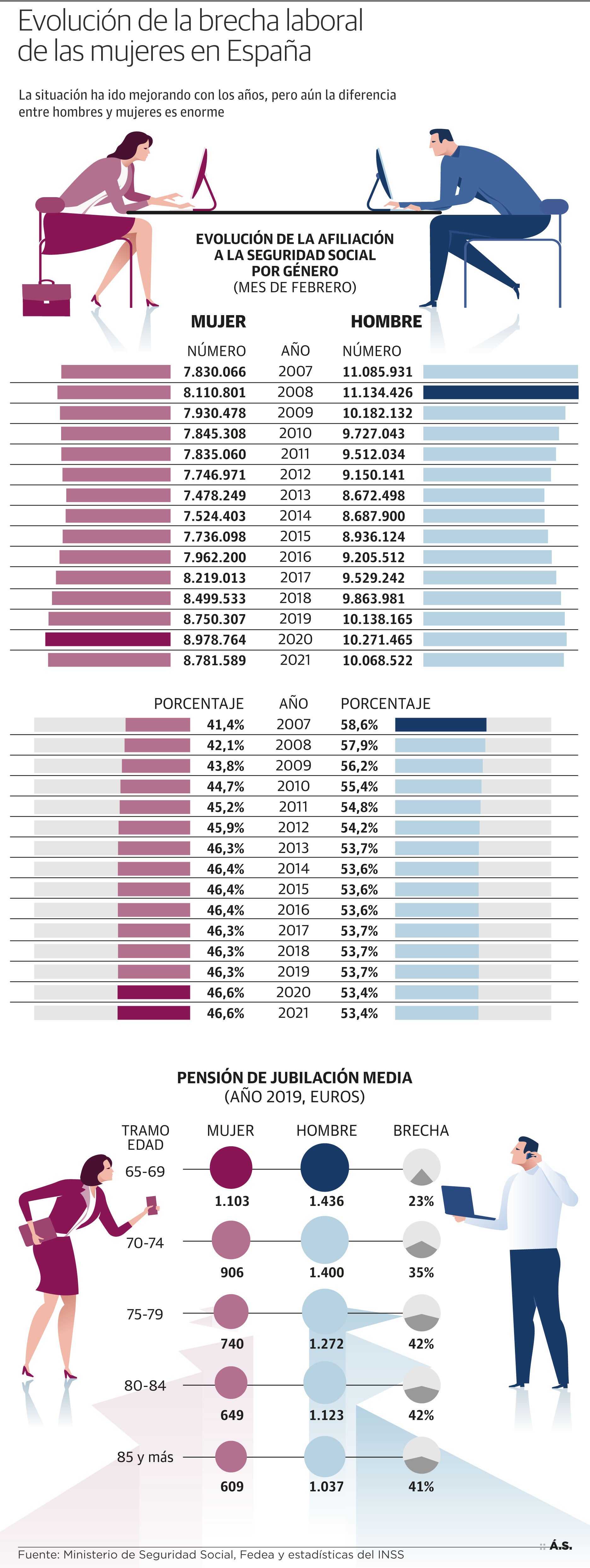 Pese a estos malos datos, la situación va mejorando. La fuerza laboral femenina ha crecido en casi un millón de personas en quince años. En 2007 había 7,8 millones de mujeres afiliadas a la Seguridad Social, lo que representaba el 41,4% del total. El último dato de febrero de 2021 marca 8,8 millones de afiliadas, el 46,6% del total.