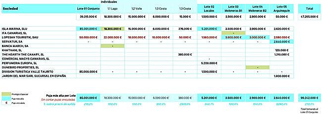 Según la información recogida por la consultora inmobiliaria CBRE, encargada del proceso de subasta tras ser designada por el administrador concursal Lener Administraciones Concursales SLP, y a la que ha tenido acceso CANARIAS7, el grupo Lopesan ha pujado por estos cuatro hoteles (que constituyen el lote 1 de la subasta) a través de dos de sus sociedades: Isla Marina y Lopesan Touristik (como puja vinculada). A través de la primera realizó una oferta de 85.001.000 euros mientras que por la segunda ofertó 50.050.000 euros. En la puja por estos establecimientos presentó también oferta División Turística Valle Taurito, sociedad de Grumasa (grupo Martinón), por un importe de 85.000.000 euros.