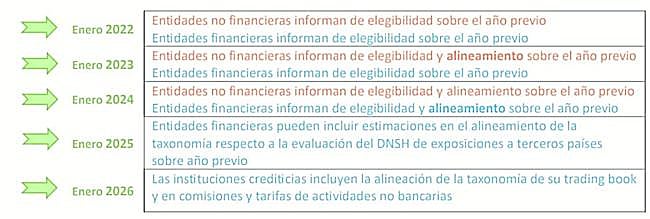 El calendario de cumplimiento para las empresas es gradual: primero se obliga a informar de la elegibilidad de sus actividades y posteriormente de su alineamiento. Además, las entidades no financieras son las primeras obligadas y luego lo son las financieras, cuyo cumplimiento depende de las actividades de las empresas que tienen en cartera.
