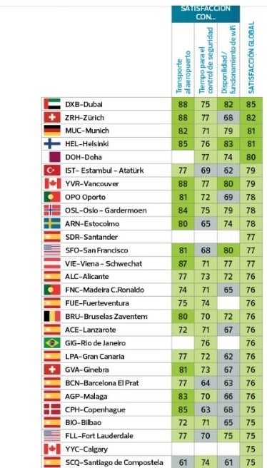 El ránking lo encabeza Dubai, seguido de Zürich, Munich, Helsinki y Doha. Entre los aeropuertos españoles, los mejor valorados son aeropuertos pequeños como el de Santander, Fuerteventura o el de Gran Canaria, así como el de Alicante.