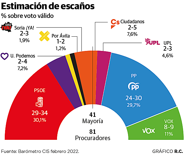 Los sondeos propios que manejan los populares indican que Alfonso Fernández Mañueco tendrá difícil acercarse a los 41 procuradores. Que el PP será primera fuerza coinciden casi todas las encuestas, salvo el CIS, pero el resultado que obtenga Vox determinará si exigirá puestos en el gobierno regional a cambio de apoyar la investidura del candidato conservador. En la dirección del partido creen que si Mañueco llega a 35 escaños, estará en condiciones de pedir la abstención a Vox porque creen que solo sumaría más que la izquierda junta.