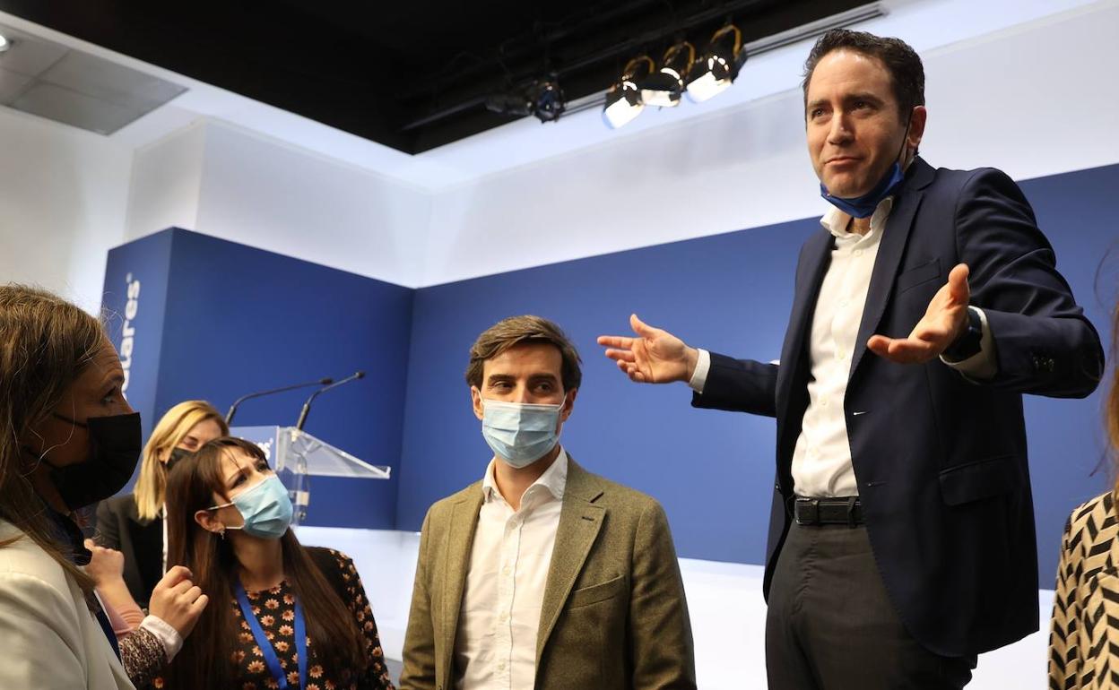 Teodoro García Egea charla, anoche, con los periodistas en la sede del PP nacional. EFE / EP