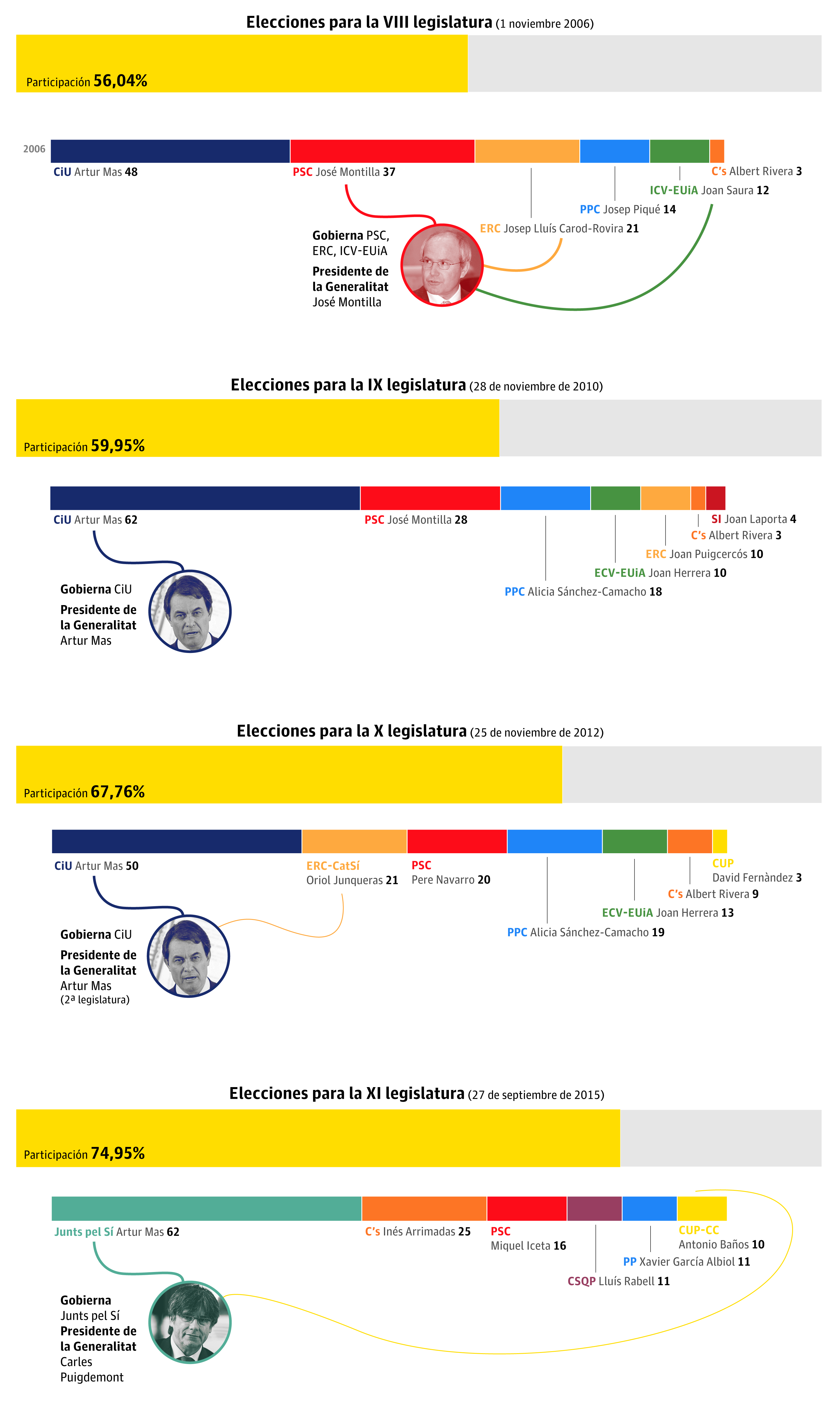 La participación volvió a descender entre 2006 y 2010. Fueron años más serenos para la política catalana marcados por el tripartito entre PSC, ERC e ICV liderado por el socialista José Montilla, y la vuelta al poder de CiU con la presidencia de Artur Más.