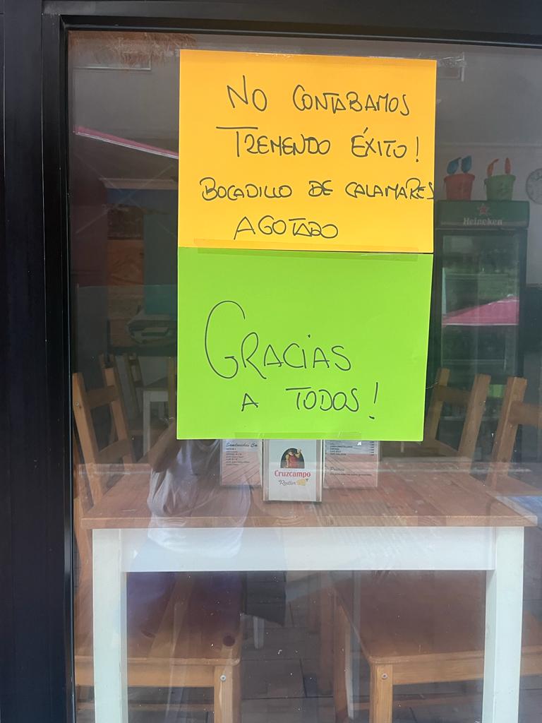 «No contábamos con este éxito, el próximo fin de semana estaremos mejor preparados», reconocen desde el propio local, que han tenido que colgar diferentes carteles en la puerta de la cafetería. Unos agradeciendo la respuesta de los nuevos clientes, y otros advirtiendo que «no tenemos calamares pa' tanta gente».