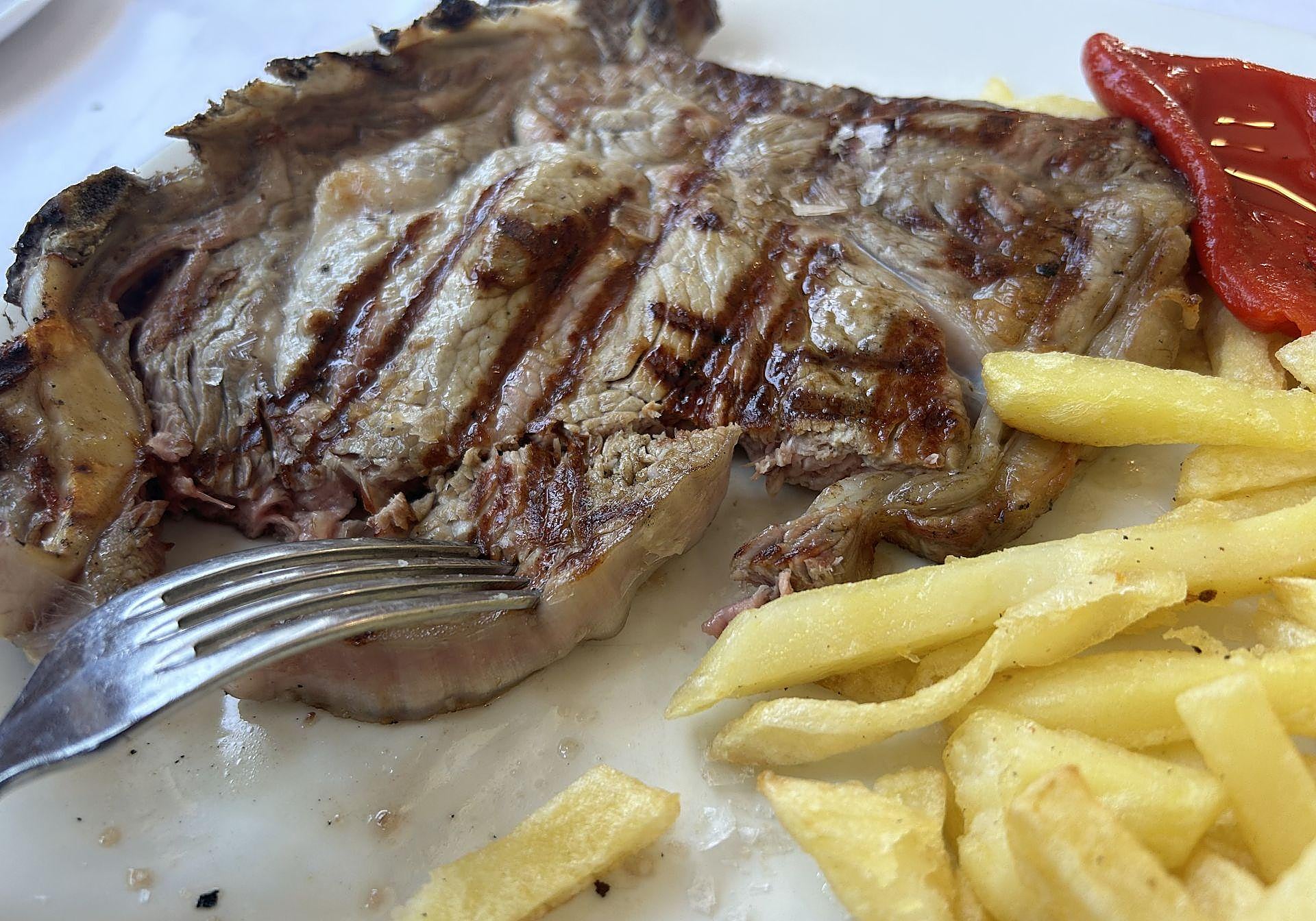 Y en el asunto de un buen asado de bovino no me doy por vencido. Galicia tiene un campo lleno de rico pasto que alimenta a uno de los mejores vacunos del mundo. He estado en los mejores asadores, y pincho. Queríamos ir a O'Pazo, que es un asador con estrella Michelín, cosa que ya no me deslumbra, mas era lunes y estaba descansando. Fuimos entonces a otra 'muy buena', Gonzaba, magnífico local en el centro de Santiago. Y otro fiasco. Es un negocio mal gestionando con un personal que corre parejo. Solo ofrece chuletón, chuleta de ternera y solomillo. El chuletón pesa un kg y, a pesar de lo grande, pedí uno, pero ordené que, antes de emparrillarlo, le removieran el hueso. Y me dijeron que nanay. Los primeros platos, bien: las croquetas estaban sosillas, buenos tomates con ventresca con un rico Tapenade. Pedí el pulpo a las brasas, con el ruego de que no viniera sobre la anunciada crema de queso. Y vino Pulpo a feira. Les dije que el tentáculo ha de asarse entero y me dijeron que allí lo sancochan, lo pican a tijera y lo pasan por la plancha. Buen solomillo y las filloas también. Y el cabreo también.