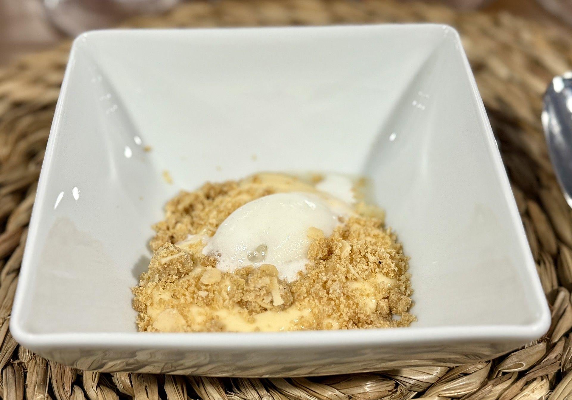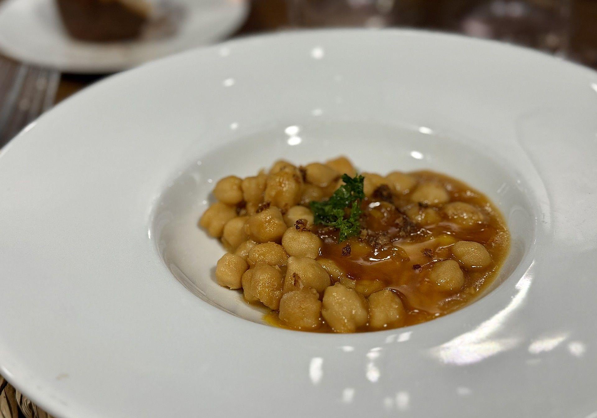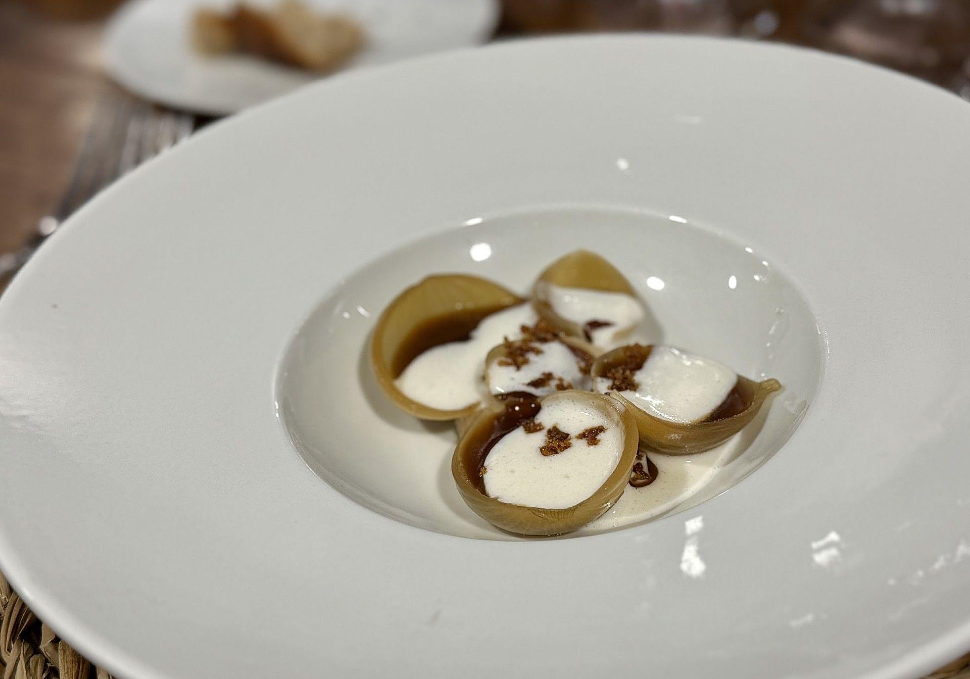 En los segundos, con la sala ya rendida a los encantos de Gran Canaria, se elevó la apuesta y la trayectoria. Richard Díaz volvió al comedor con su cebolla-almendra, un plato que conmueve por su textura: elegante y tersa y en paralelo, Ortega sorprendió con su garbanza con cresta y yema: una interpretación sofisticada de ese grano tan fundamental en la tradición gastronómica grancanaria. Su grano intacto y cremoso llevaron a cada uno de los comensales hasta el recetario tradicional, desde la primera cucharada.