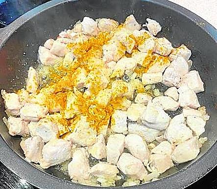 Añadiremos las especias, curry, cúrcuma y jengibre y mezclaremos bien con el pollo y la cebolla (FOTO 5).
