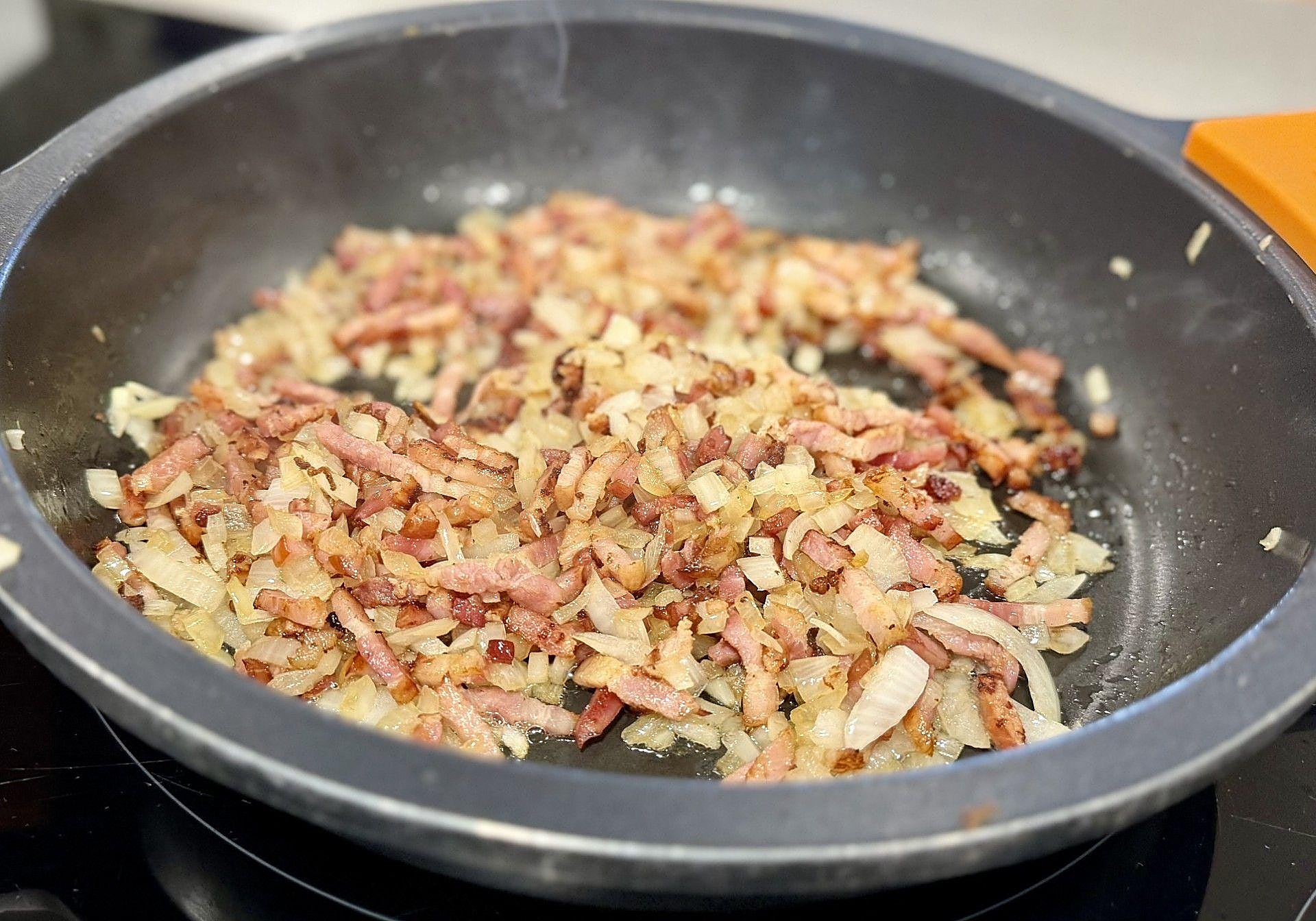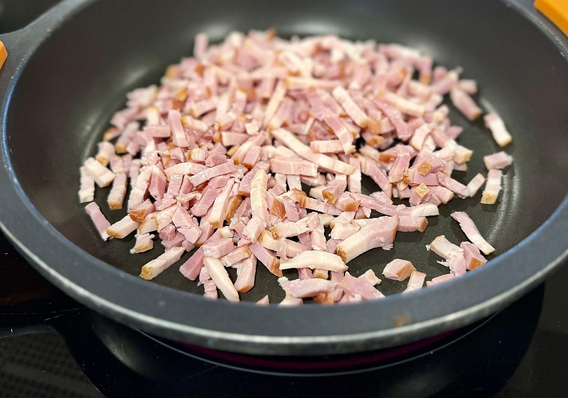 En un caldero bajo con buen diámetro, saltearemos el bacon sin nada de aceite.