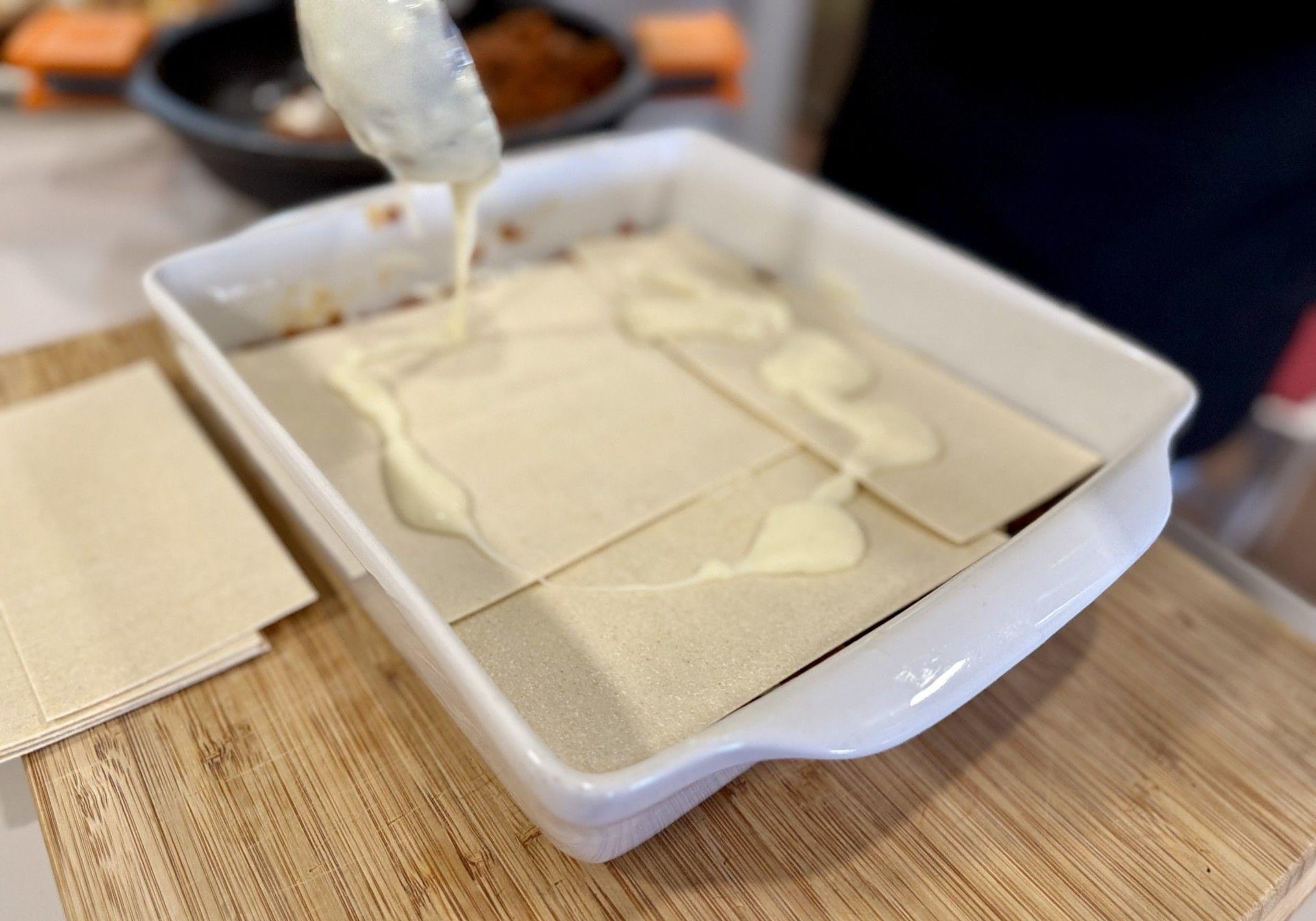 Sobre esta, volvemos a cubrir la superficie con placas de lasaña La Isleña y las volvemos a hidratar con bechamel.