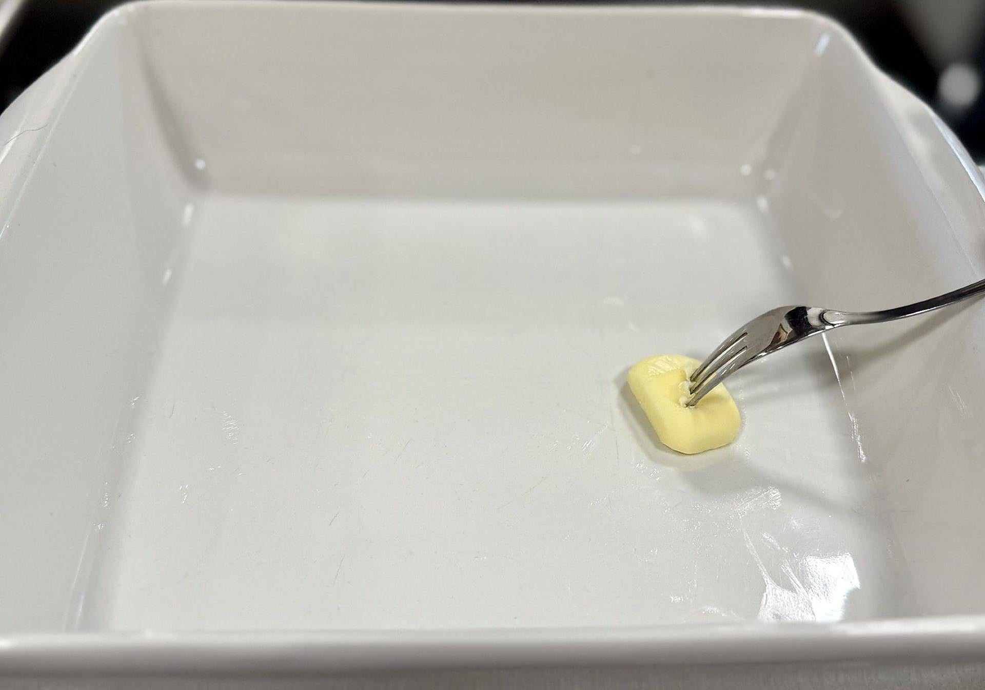 Una vez pasado el tiempo de guiso del ragú, comenzamos a montar nuestra lasaña y para ello, cubrimos con una nuez de mantequilla la base de la fuente de horno sin olvidar los laterales.
