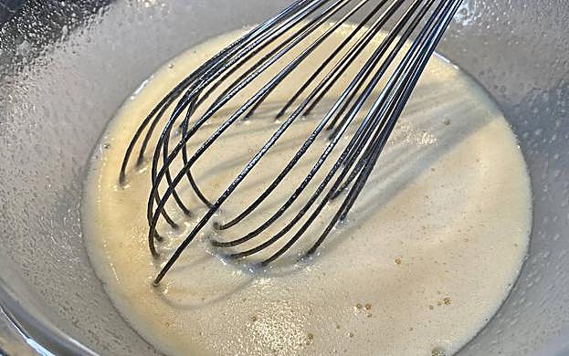Segidamente, iremos batiendo los huevos junto con el azúcar. Batiremos hasta que el azúcar esté completamente integrado, es fácil porque usaremos azúcar ya molida (azúcar glas). Reservamos.