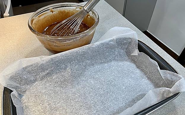 Lo siguiente que haremos, será preparar el molde, lo mejor es utilizar uno rectangular. Yo lo cubro con papel vegetal para que no se pegue y sea más fácil desmoldarlo.