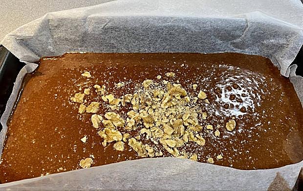 Verteremos la mezcla en el molde y daremos unos golpecitos para afianzarlo y que llegue bien a todos los rincones. Incorporaremos las nueces, que las habremos picado ligeramente y las repartiremos en la mezcla con la ayuda de un tenedor.