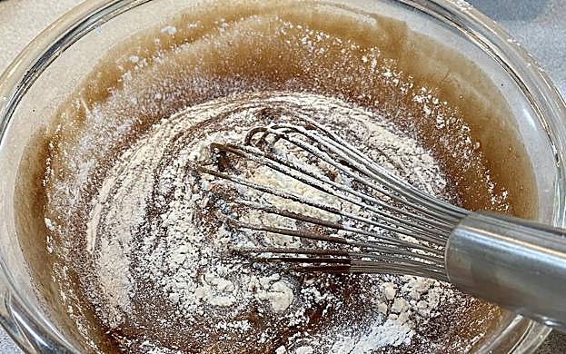A la vez que vayamos vertiendo el chocolate, iremos batiendo con suavidad hasta que lo tengamos totalmente integrado. Este es el momento idóneo para ir encendiendo el horno a 180º calor arriba y abajo y función ventilador si la tuviéramos. Acto seguido verteremos la harina sobre la mezcla. Para ello nos ayudaremos de un tamizador y en caso de no tenerlo, pasaremos la harina por un colador de malla fina. Mezclamos e integramos bien. Si se van haciendo burbujas no se preocupen, eso dará esponjosidad a nuestro brownie.