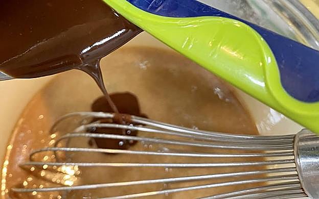 Una vez que el chocolate no esté tan caliente, lo iremos incorporando a la mezcla de huevos y azúcar, muy despacio. No lo mezclaremos sobre la marcha porque si vertemos el chocolate muy caliente, correremos el riesgo de que se cocinen los huevos.