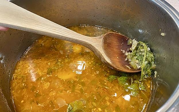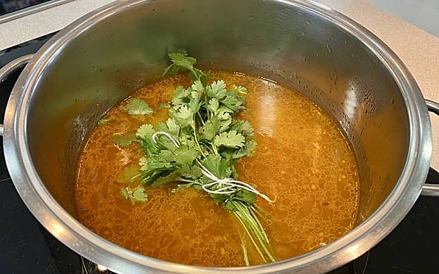 Mientras el caldo toma temperatura, iremos lavando el cilantro y lo añadiremos al caldo. Subiremos la potencia y removeremos de vez en cuando, hasta que rompa el hervor.