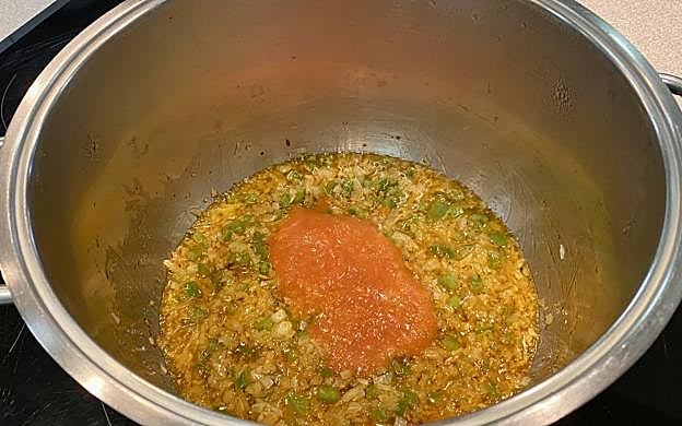 Mezclaremos bien, mantendremos la temperatura a potencia media y mientras se va guisando todo, iremos rallando el tomate. Una vez rallado, lo incorporaremos a la fritura también.