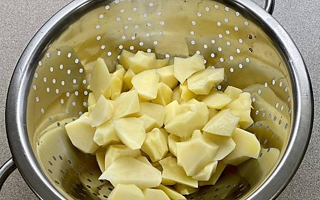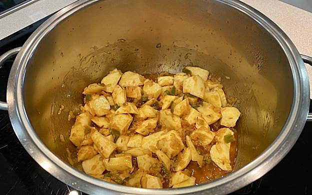 Añadiremos las papas cortadas a la fritura y removeremos integrando toda la base.