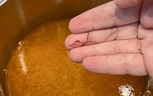 Acto seguido, cubriremos de agua hasta cubrir las papas, justo por encima de estas. Diluiremos también unas hebras de azafrán y rectificaremos de sal.