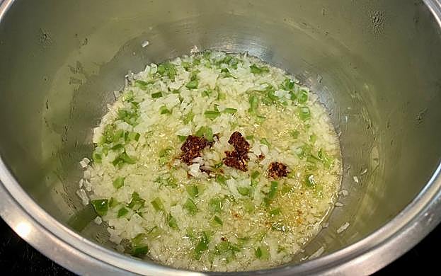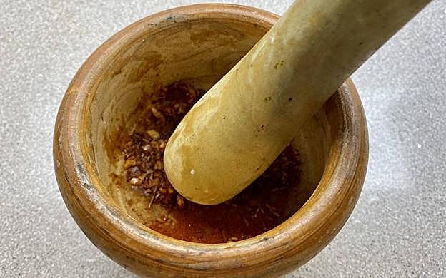 Una vez que la cebolla y el pimiento estén melosos, añadiremos la pasta que hemos preparado en el almirez, a la fritura.