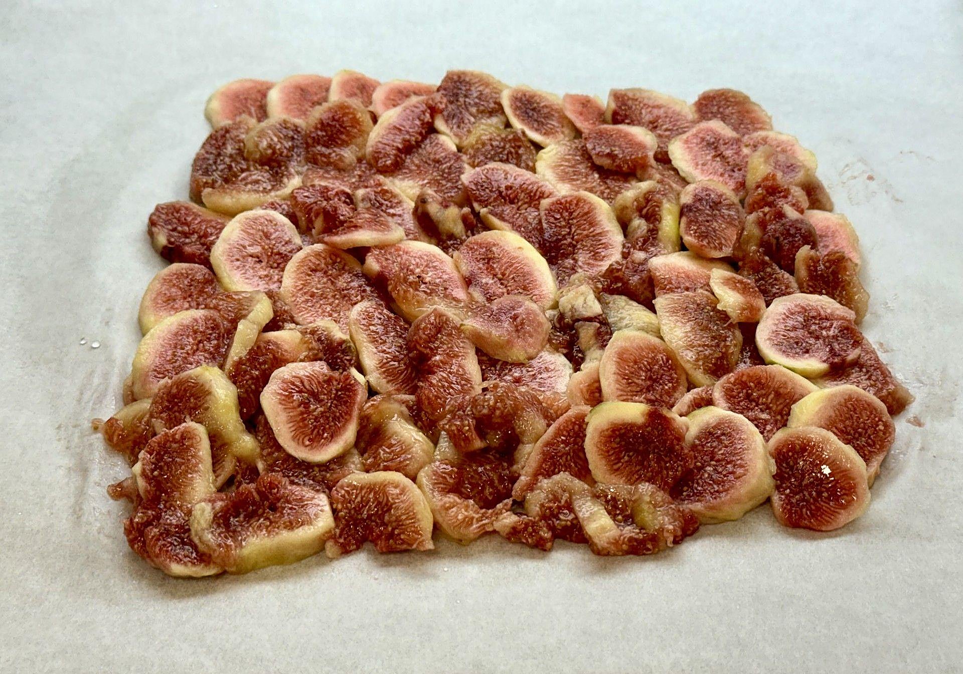 Colocaremos una de las láminas de papel vegetal sobre una superficie plana y sobre éste iremos disponiendo los higos, colocándolos uno sobre otro en el borde y formando, más o menos un cuadrado.
