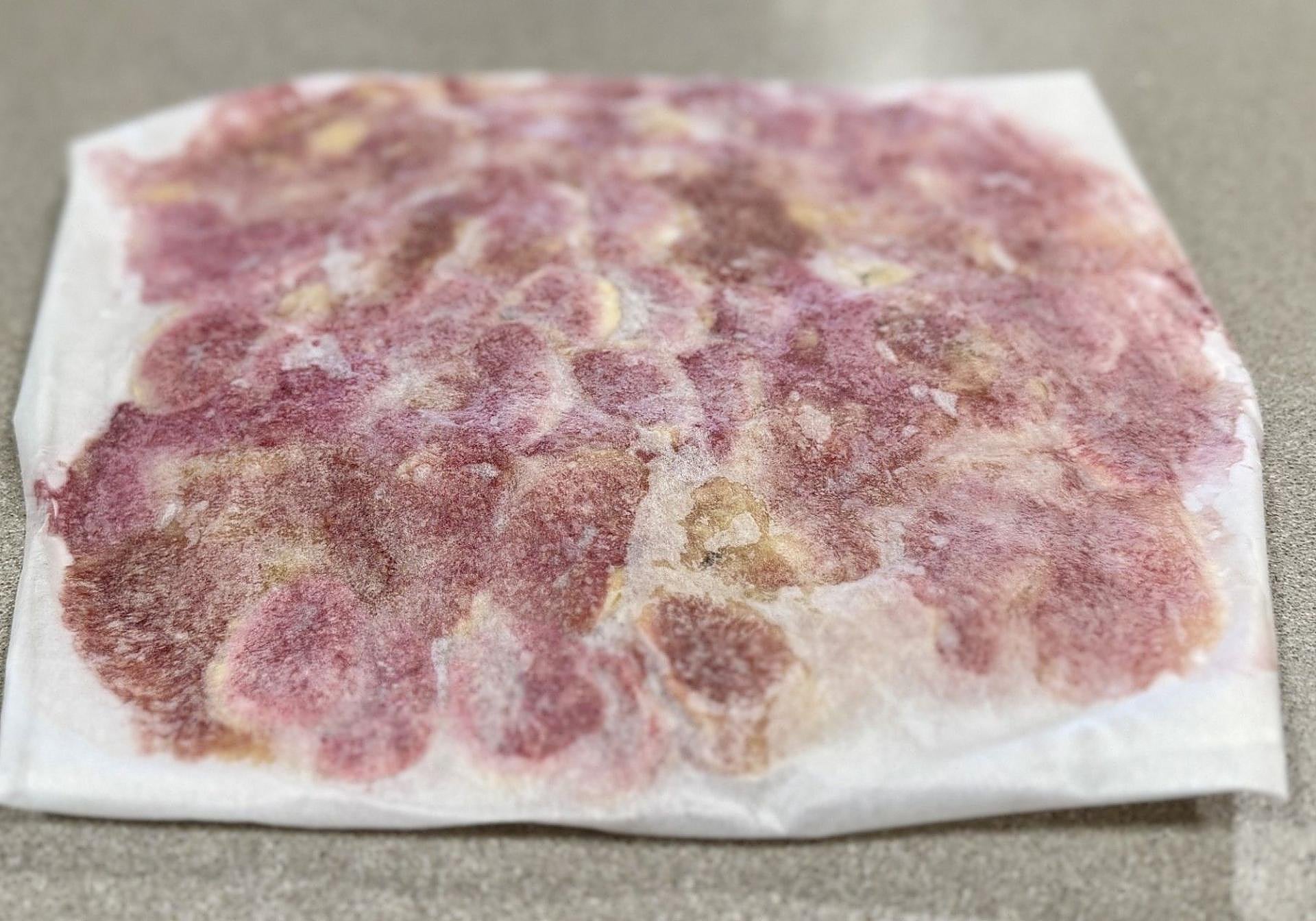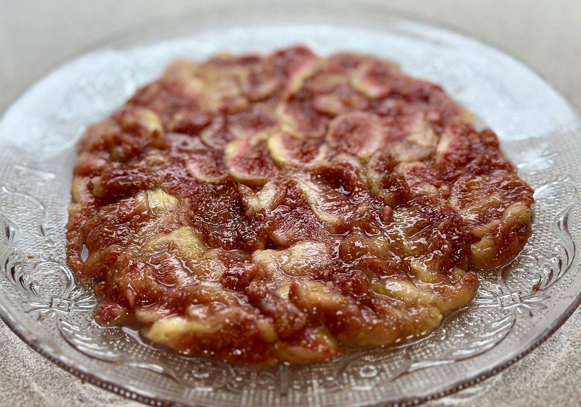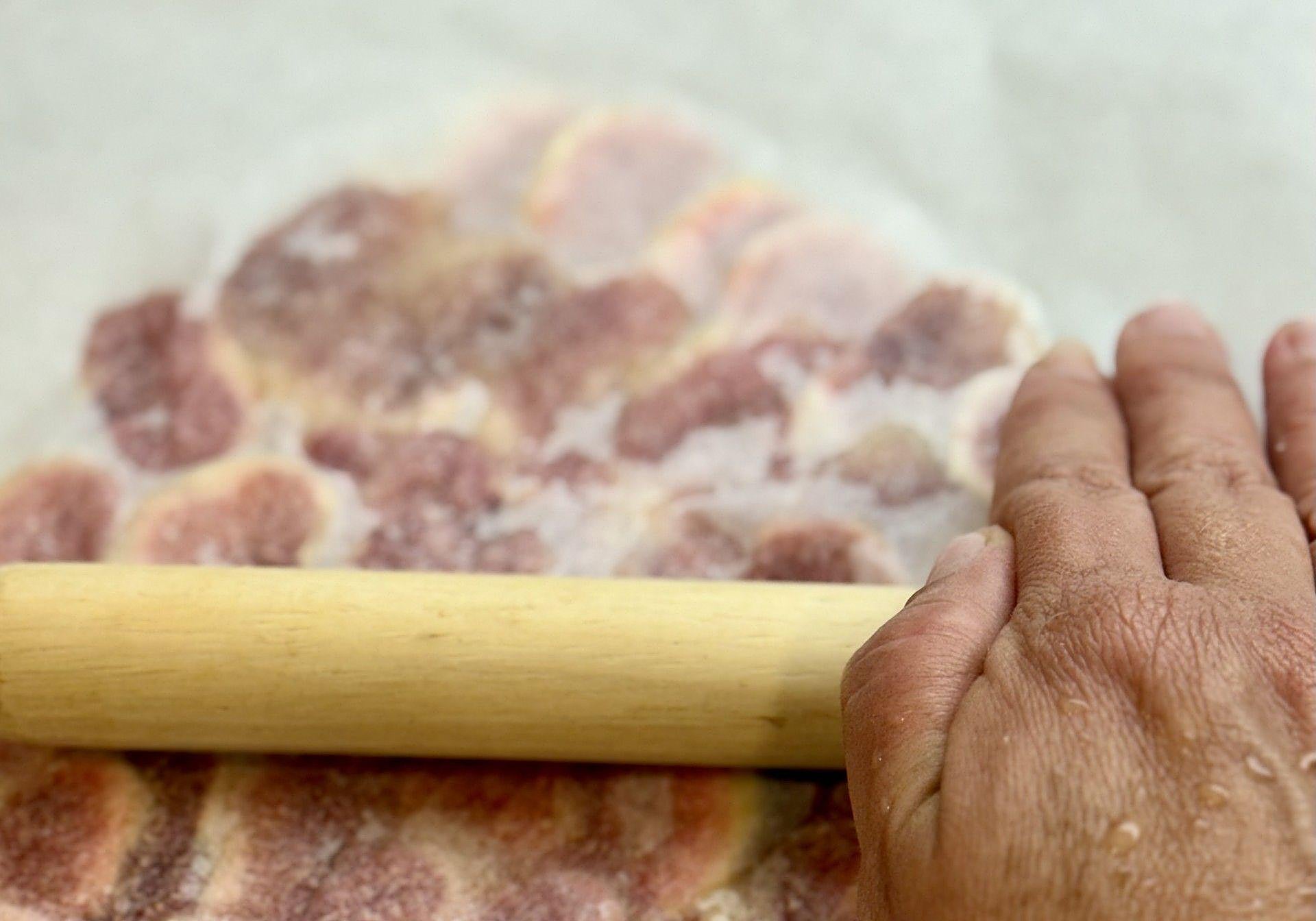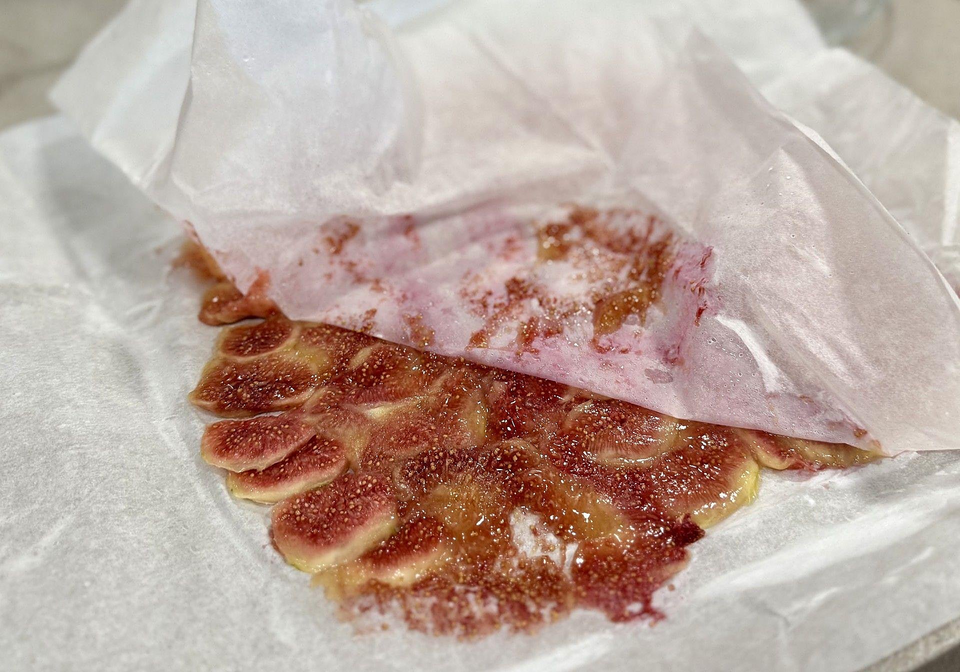 Cuando los tengamos todos colocados, cubriremos con el segundo papel vegetal y con paciencia y cariño, pasaremos por encima un rodillo para que no queden espacios libres entre las rodajas de higos y aquí aprovecharemos para ir dándole forma redondeada.