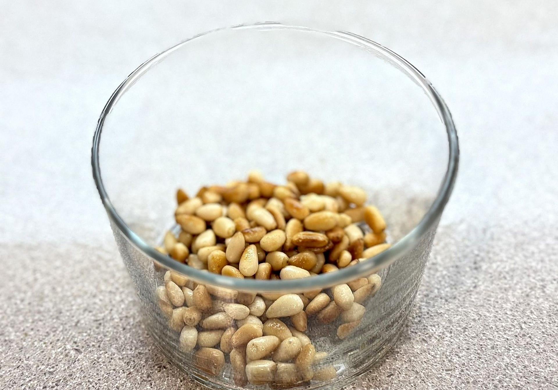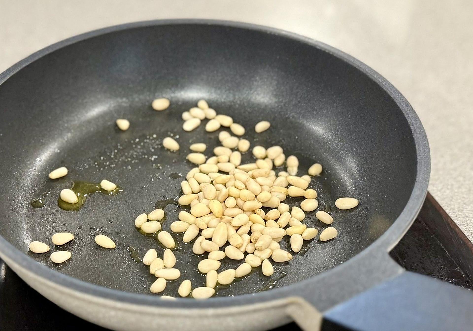 Mientras tanto podremos ir preparando la vinagreta y para ello tostaremos ligeramente a potencia media los piñones en unas gotitas de aceite de oliva.